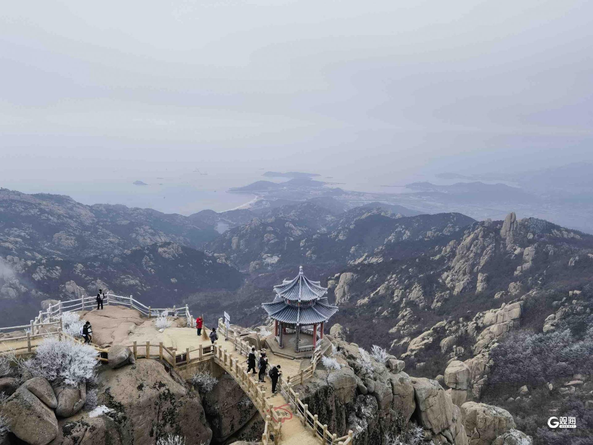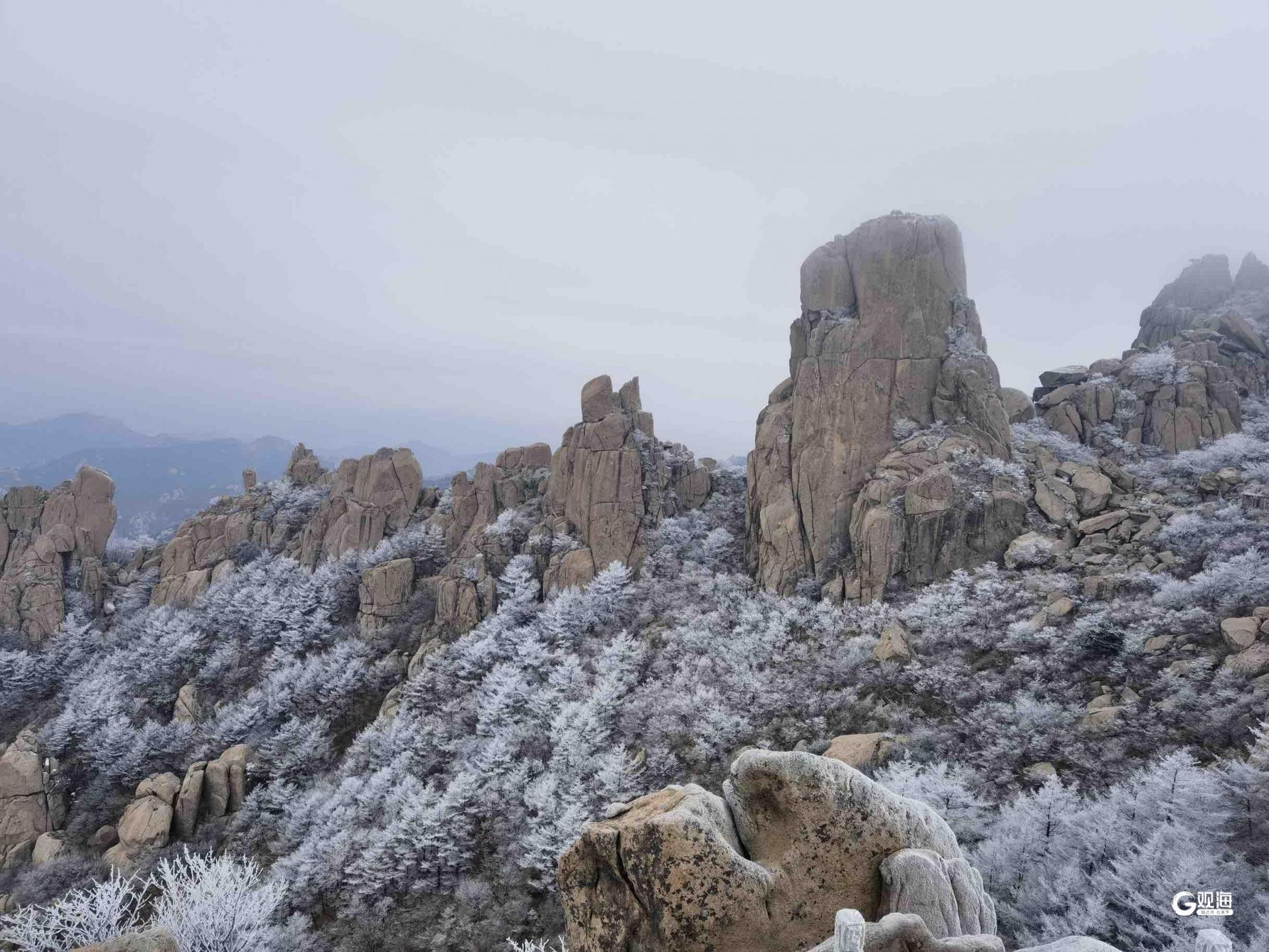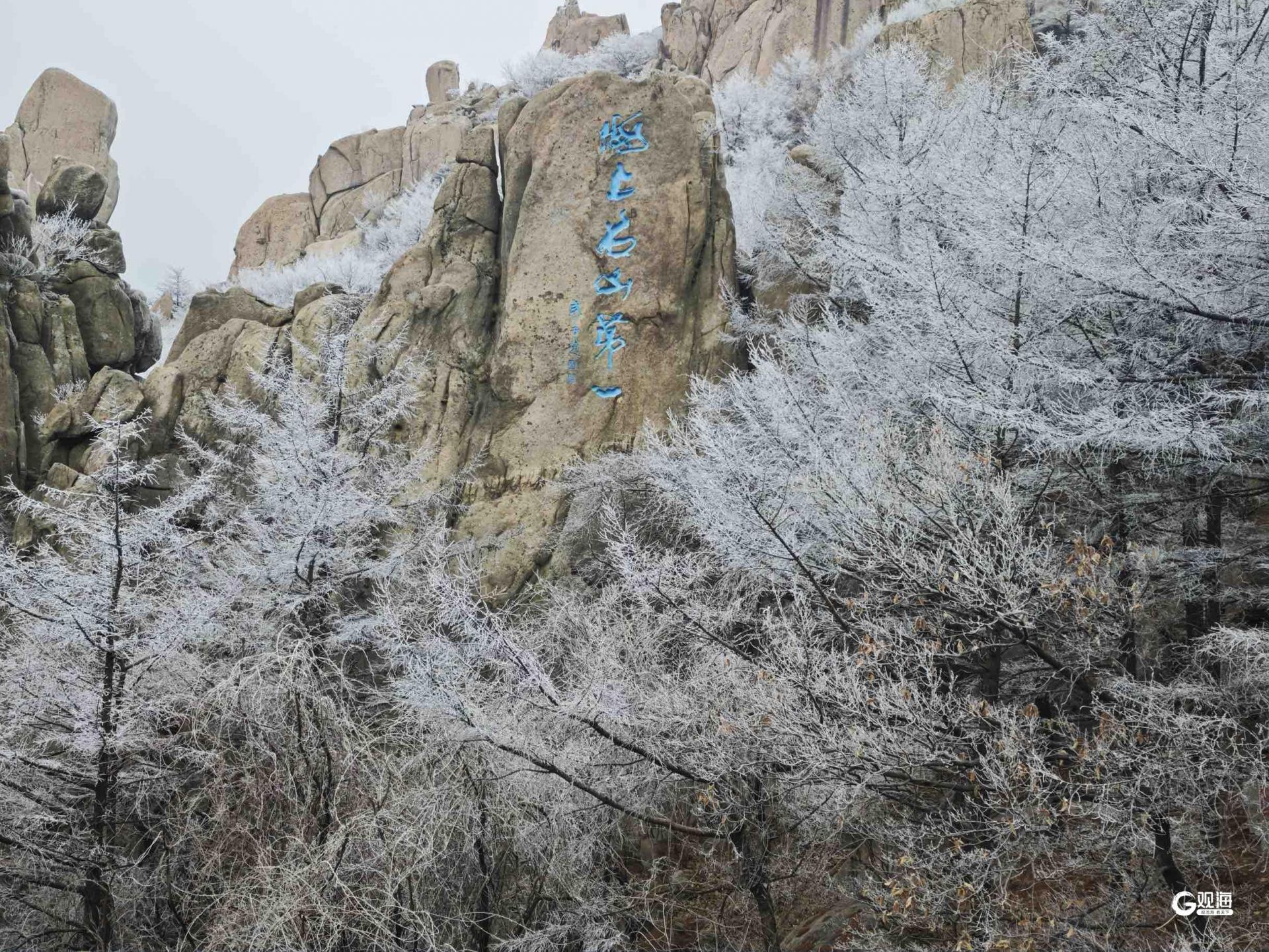 青島日報社/觀海新聞1月18日訊 新一股冷空氣到訪青島,1月18日的嶗山巨峰,冬日限定款奇景——霧凇再次上線。