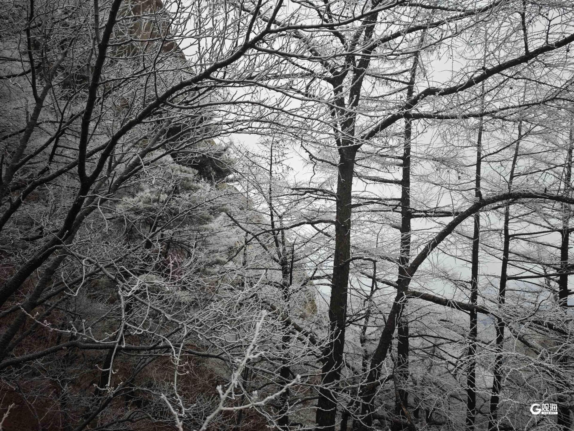 從景區望去,平日里雄奇的山石與蒼勁的松柏,此刻都被晶瑩剔透的冰晶包裹,如夢似幻,仿佛讓人穿越進童話世界。