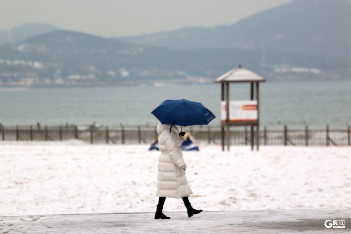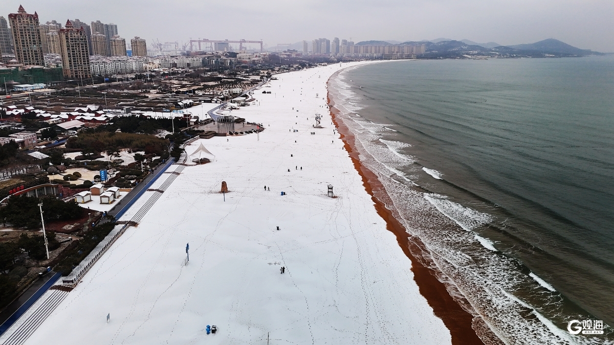 青島日報社/觀海新聞1月18日訊 2026年青島首場降雪如約而至,將金沙灘裹進一片純粹的白茫茫。細膩的雪花鋪滿海岸,往日的金沙化作松軟的雪絨毯,海浪輕吻雪岸,留下深淺交織的詩意水痕。