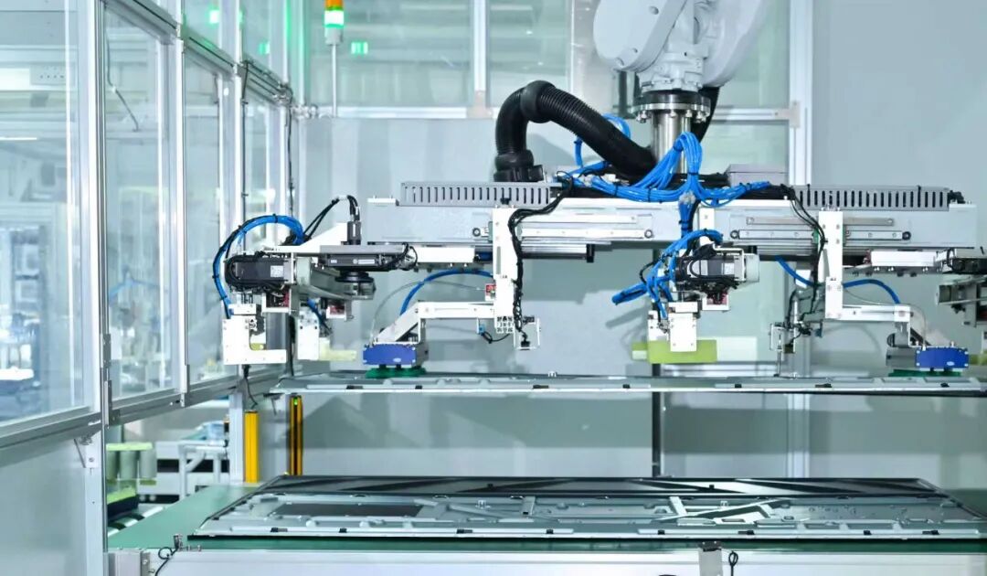 海信視像之所以能在行業內率先實現“面板自動精準卡合”,首先是通過多組高精度視覺相機為機器人賦能“眼睛”,再搭配AI“大腦”實現自動撕膜、精準裝配和實時校準的全流程自動化操作,從而實現0.1毫米級的精準定位,確保每次抓取和裝配都毫厘不差。