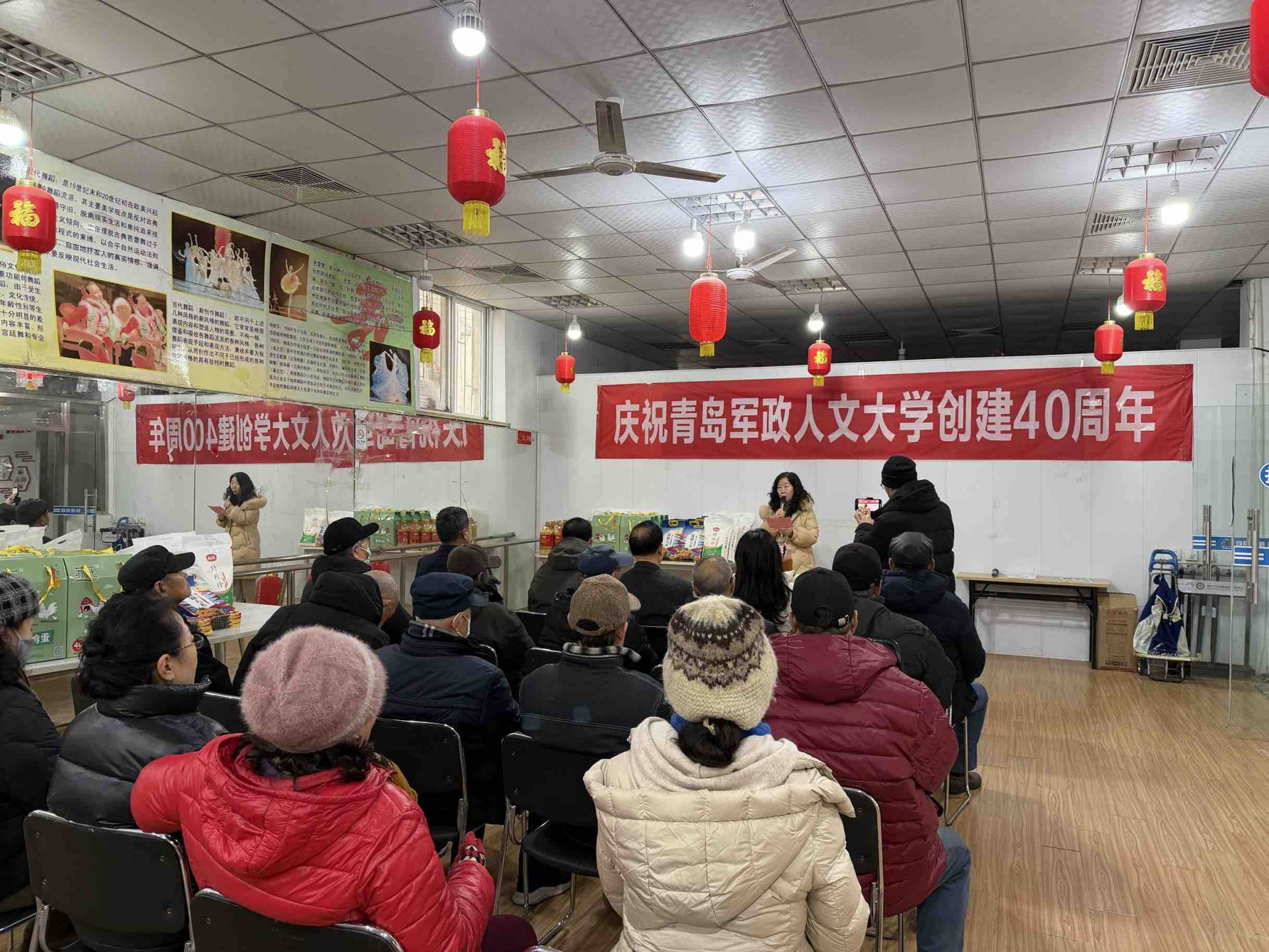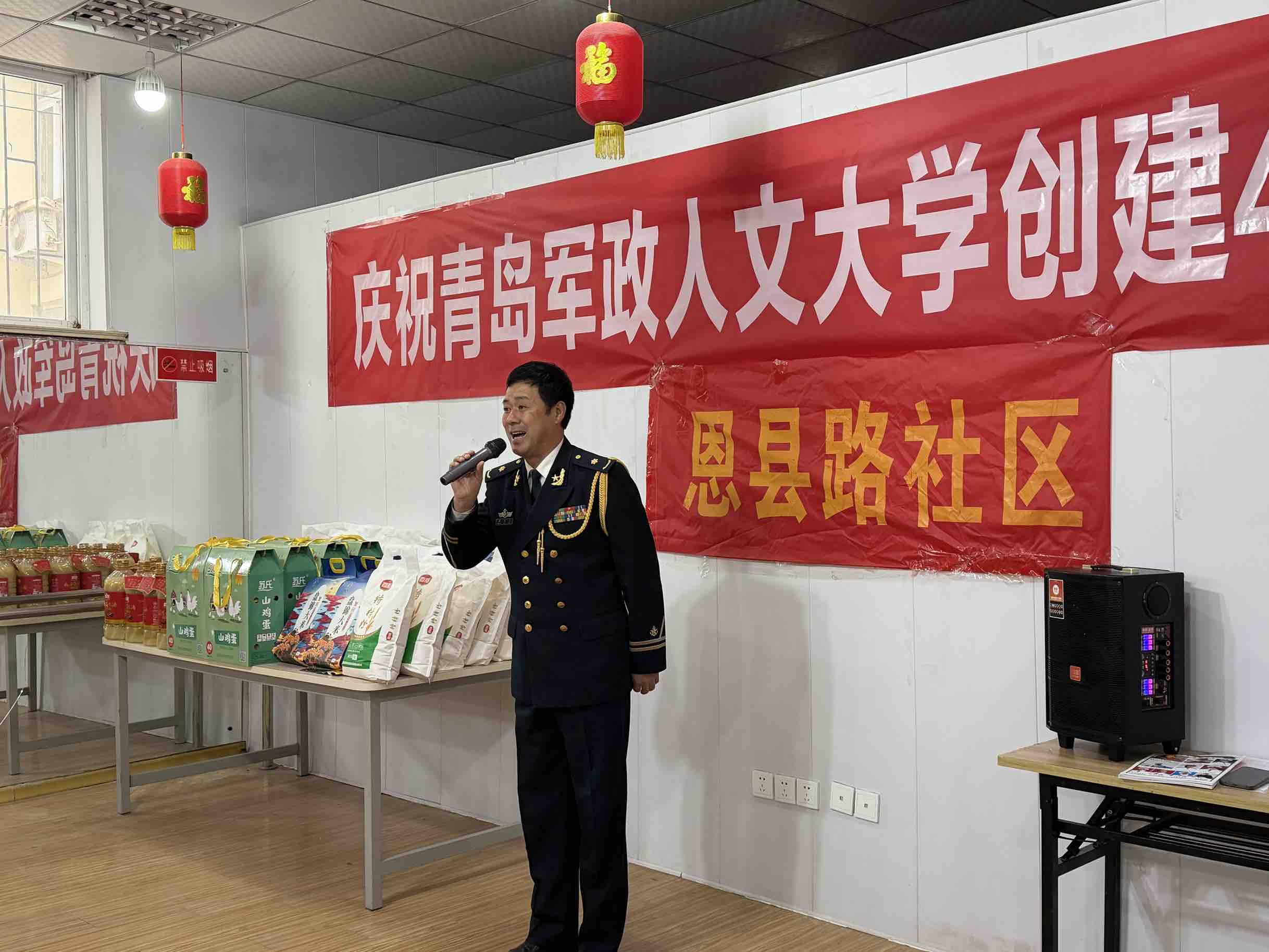 31日上午,市北區即墨路街道恩縣路社區活動中心充滿歡聲笑語。作為建校四十周年的重要活動之一,軍大師生同社區工作人員一道,為社區獨居老人、老黨員等送上慰問品與節日祝福。