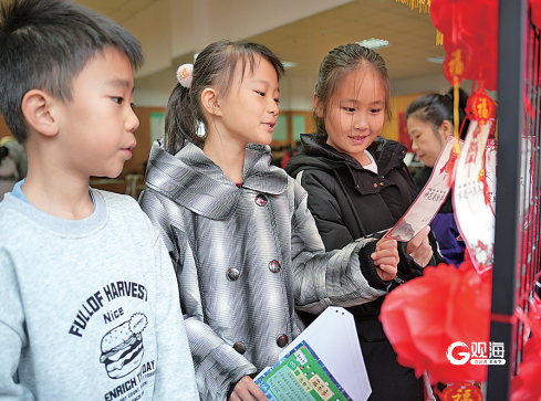 1月26日上午,青島香港路小學舞蹈教室內,一場以“傳統節日”為主題的期末“樂考”正在進行中,二年級學生手持《我的節日記錄本》,穿梭于春節、元宵、端午、中秋、重陽5大主題體驗區,開展一場趣味十足的能力素養闖關活動。在“春節”區,他們根據《對韻歌》內容補全春聯空缺字,小組合作演唱春節歌曲;在“元宵”區,他們猜燈謎、學組詞,擺“湯圓”、學英語;在“端午”區,他們挑戰數學關卡,獲取“粽葉”,書寫節氣諺語;在“中秋”區,他們探索月相變化規律,解決“月餅分享”數學題;在“重陽”區,他們體驗手腳并用的“登山”游戲。