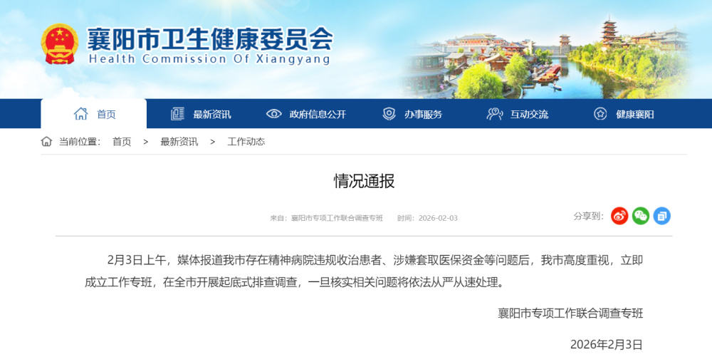 精神病院違規收治患者涉嫌套取醫保資金,湖北襄陽通報 2026-02-03 10:52 襄陽衛生健康委員會 0 2月3日上午,媒體報道我市存在精神病院違規收治患者、涉嫌套取醫保資金等問題后,我市高度重視,立即成立工作專班,在全市開展起底式排查調查,一旦核實相關問題將依法從嚴從速處理。 襄陽市專項工作聯合調查專班 2026年2月3日 責任編輯:孫源熙