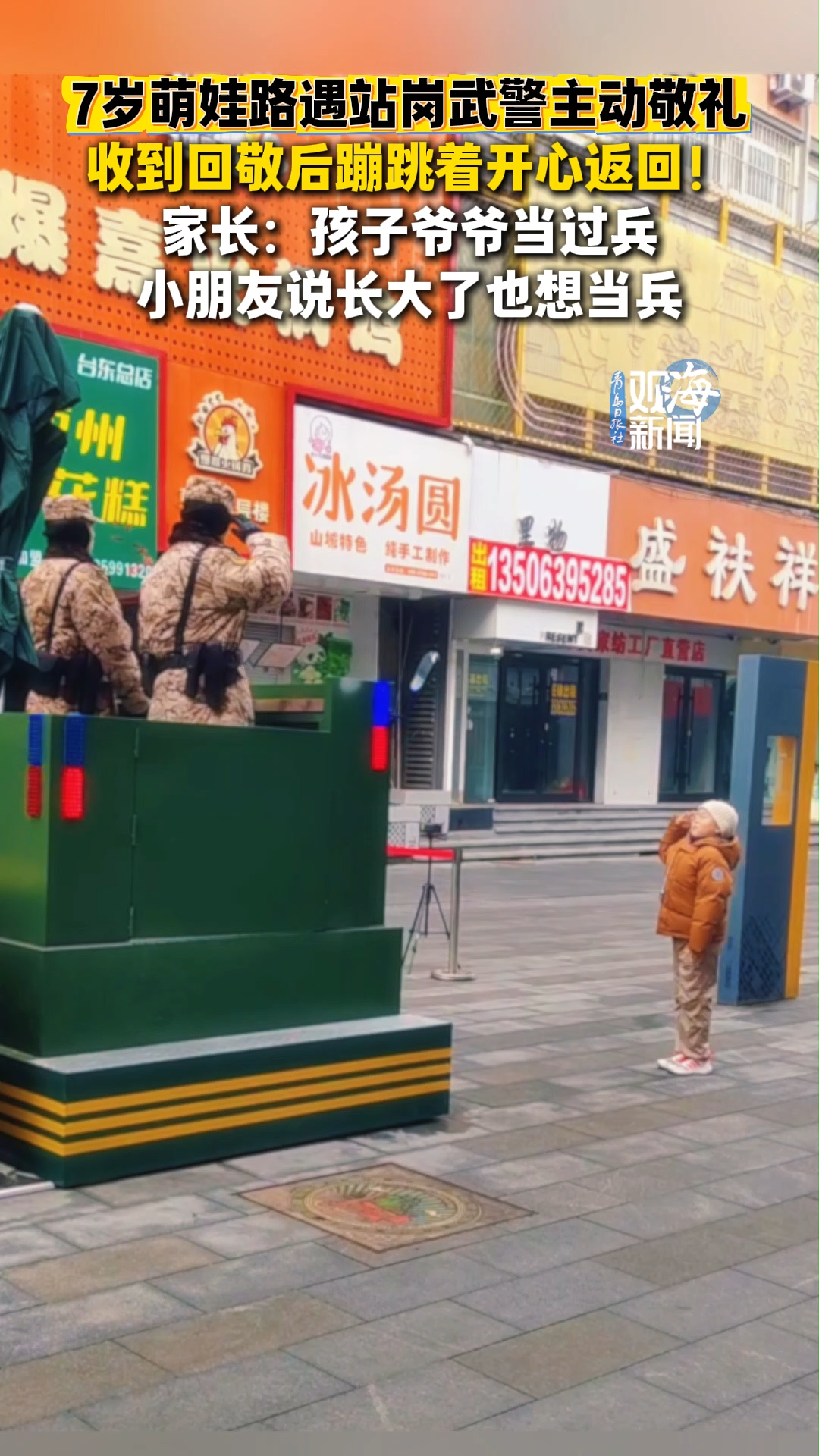7歲萌娃路遇站崗武警主動敬禮,收到回敬后蹦跳著開心返回